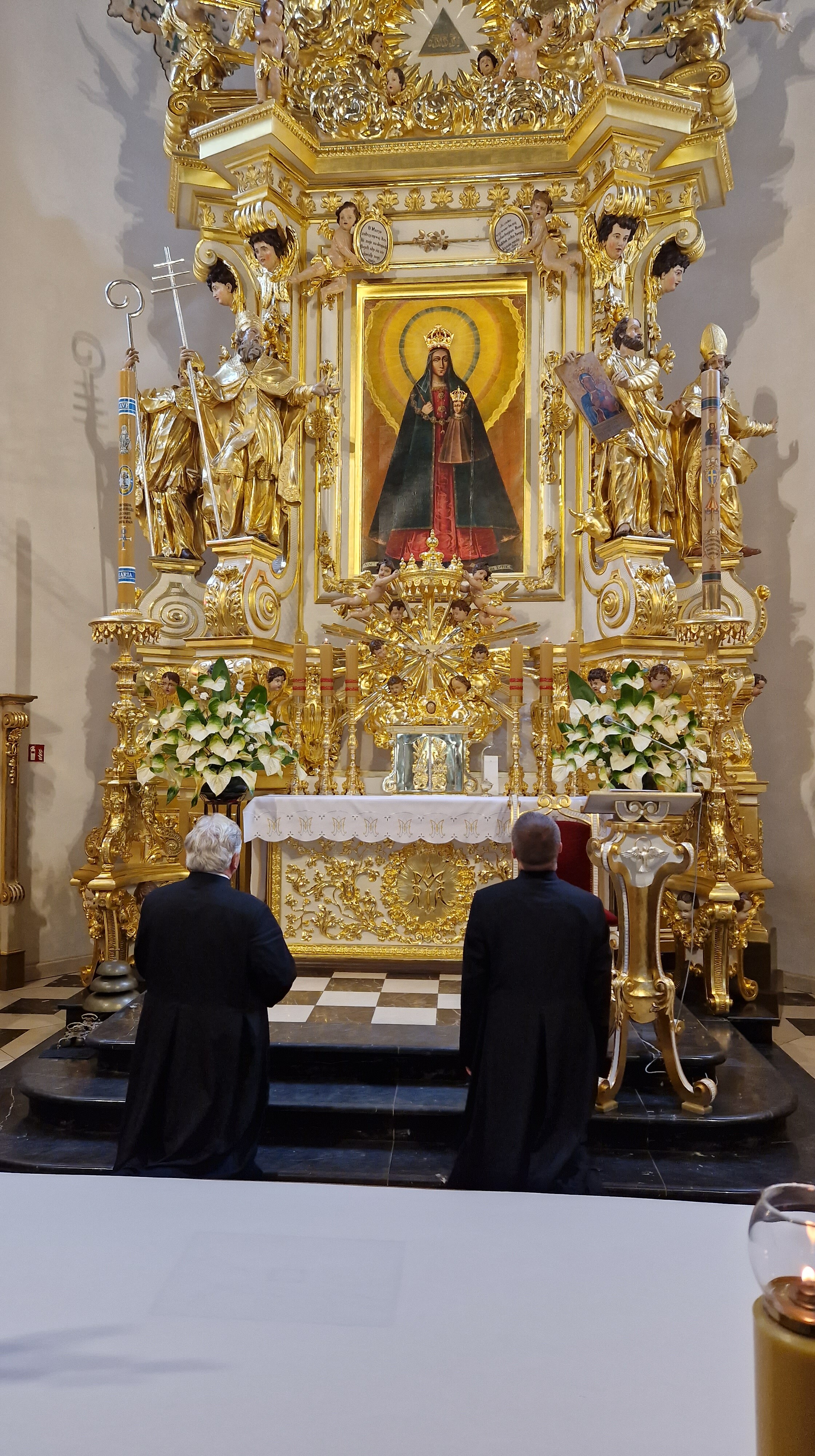 W dniu 31 sierpnia odbyła się pielgrzymka kapłanów Diecezji Siedleckiej do Kodnia. Jest ona związana z uroczystością jubileuszową rocznicy 300-lecia koronacji Obrazu Matki Bożej Kodeńskiej i nałożeniem na ten obraz nowych koron, pobłogosławionych przez Ojca Świętego Franciszka. Ponieważ wielu kapłanów z powodu różnych obowiązków nie mogło uczestniczyć w uroczystości 15 sierpnia, ksiądz biskup Kazimierz Gurda zaprosił kapłanów dzisiaj na to modlitewne spotkanie. Z naszej parafii na pielgrzymkę udał się ksiądz proboszcz i ks. wikariusz. Podczas tej pielgrzymki wyrażaliśmy wdzięczność za obecność Maryi na podlaskiej ziemi w Jej łaskami słynącym Wizerunku Matki Bożej Kodeńskiej - Matki Jedności.